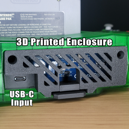 Amazing upgrade to power delivery via usb C this is the cleanest mod for the n64 as its gonna get flush clip in design with 3d printed enclosure for board protection seriously if you plan on taking your n64 on the go this is the move. Be sure to buy a power brick thats rated for 12v 3a to ensure stability 10/10 would buy again.